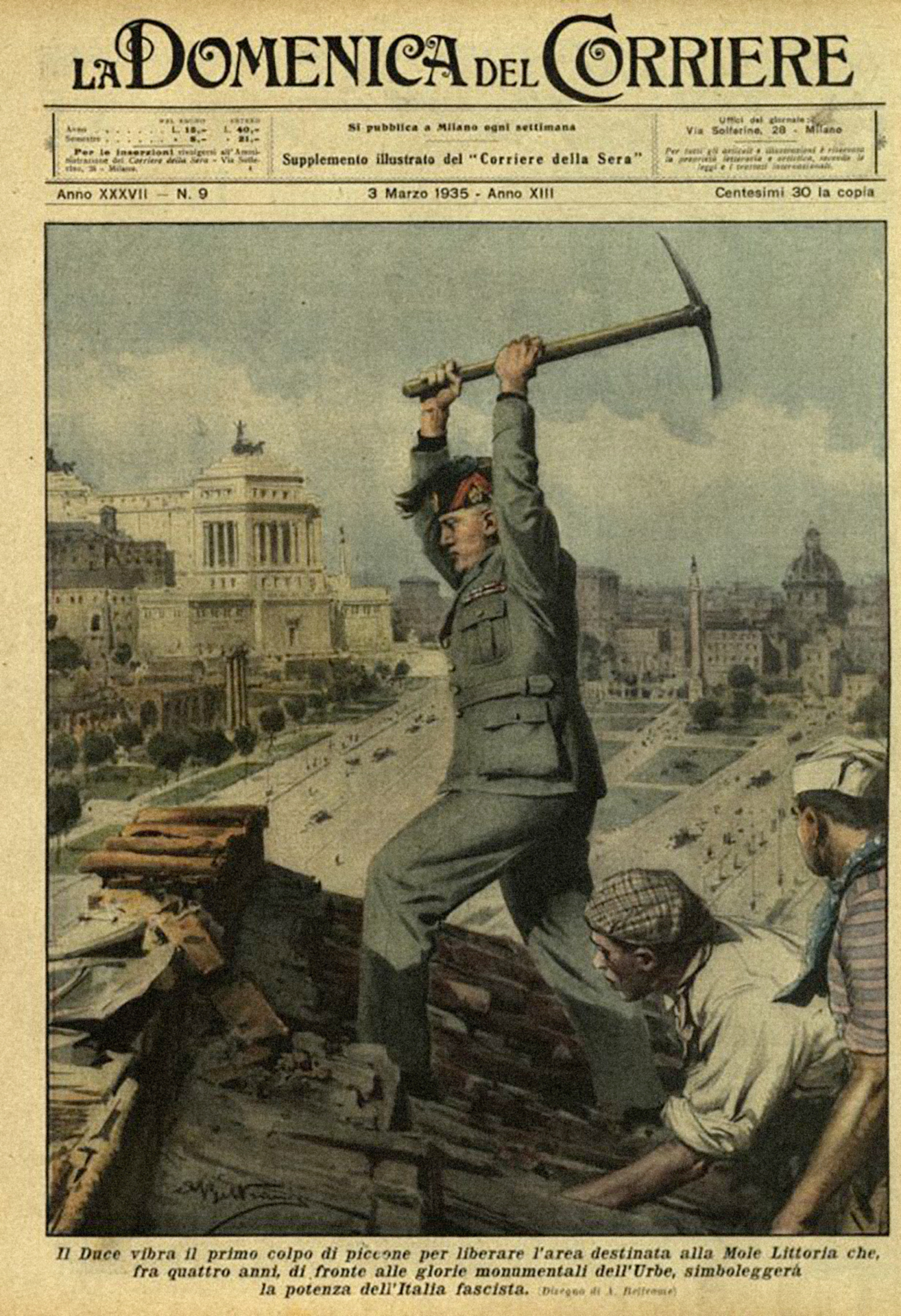 Fascism’s fascination with theater resulted in major urban modernization developments, turning the City of Rome (and other cities in Italy) into a back-drop for the Duce’s performance as the “New Augustus.” In a speech in 1925 Mussolini declared: “In five years Rome must be seen to be marvelous to all the people of the world: vast, ordered, powerful, as it was in the first Augustan Empire.” The Plan of 1931, produced under Mussolini’s eye by a committee representing divergent views, was based on five major points. First, archaeological sites (especially those of the Augustan era) were central to the presentation of Fascism as a revival of the Empire. Second, a triumphal way, the Via dell’Impero would have to be created to link the Piazza Venezia with a new road to Ostia and the sea (Via del Mare). Third, a monumental development to the North (housing, sports arenas, new roads and bridges) should form a gateway to the modern city—this became the Foro Mussolini. Fourth, the southern areas along the Via del Mare would need a great feature which turned out to be the exhibition city of EUR. Fifth, the working class should be moved out of the city center into new districts in the west, east and south. This amounted to a dramatic reshaping of the urban landscape. Fascist urbanism relied heavily on sventramenti, the destruction of existing buildings. The maneuver’s aim was to liberate ancient structures from successive additions and destroy the idea of Rome as a palimpsest of historical layers. The rhetoric of liberation was frequently deployed, with Mussolini claiming that “the millennial monuments of our history must loom gigantic in their necessary solitude.” Sventramenti created a visible, direct connection between modern and ancient Rome, it also systematically obliterated traces of low-income life in Rome. One of the “liberated” symbolic sites of the regime was around the Mausoleum of Augustus, where—among other projects—the Mole Littoria was planned. A truly pharaonic building, over 200 meters high, resting on a square platform of 250 by 250 meters, the Mole Littoria was intended to eclipse any other high-profile building inside Rome, including St Peter’s Basilica. In October 1934, Mussolini made a speech outlining the project and, seizing a pickaxe, cried “And now let the pickaxe speak!”. The image (in film, photograph and painting) of Mussolini energetically wielding a pickaxe proved an effective means of projecting the demolition of the old Rome as a “revolutionary” Fascist act. The iconography of the pickaxe and the pneumatic drill became almost as strong as that of the dagger and machine gun in the monumental art of the period.