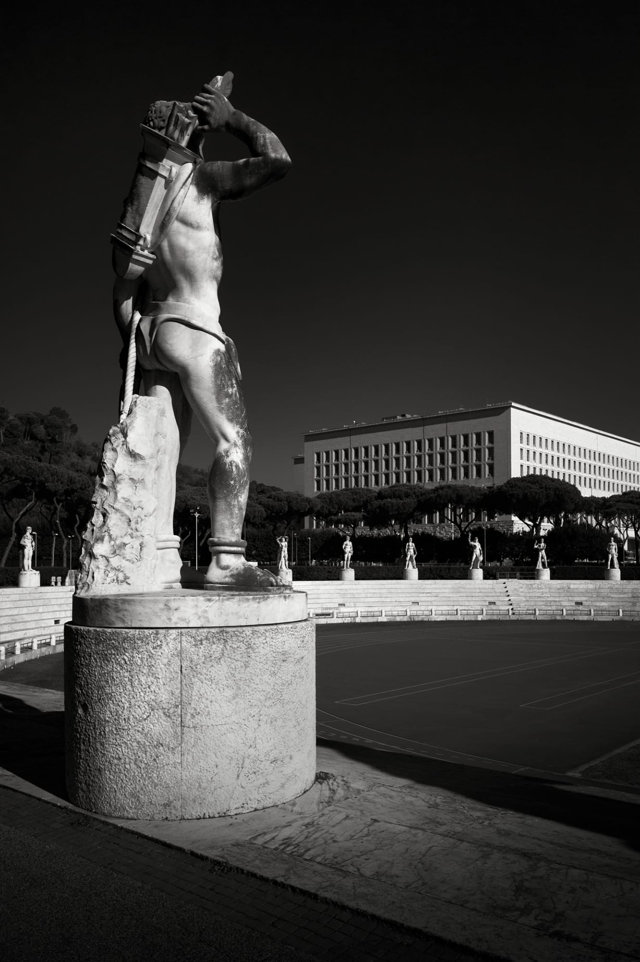 The Fascist symbolic armory consisted of black shirted uniforms, dagger salutes, feats of aviation, and colonial exploits (not to mention the feats of “corporatism”). But much of Fascist symbolic politics did revolve around the Duce, who spoke to the people from balconies and in regular radio addresses. Explaining Mussolini’s prominence as the ideal aesthetic subject, one art historian at the time noted his effortless negotiation between past glories and prospective challenges: “his greatness consists in the superlatively modern universality of his mind, which extends from historical exegesis to the most arduous problems of the future.” The greatness was very often meant literally—in spite of the short stature of Mussolini. The developing plans for the “New Rome” were to have included an 86-meter high statue of the Duce, designed by Aroldo Bellini, as an attempt to personify Fascism by transforming ideology into material form. A public announcement of its creation was made in the wake of the conquest of Ethiopia, though the idea of a gigantic statue at the Foro Mussolini was the fruit of several years’ work. The Statue of Liberty provided the main point of reference, both in terms of global renown and engineering. Most probably due to lack of funds, only the head and the limbs were ever completed, (at least both feet and one knee were cast beside the head of the Colossus). The statue’s facial features were delineated, so as not to create a precise representation of Mussolini but merely to evoke his image through a generic Herculean figure, with the intention that future generations should read into the mythologized statue a sublimated and deified ideal of the Duce. The statue was meant to be an updated version of the Colossus of Nero and to depict “the Likeness of He whom we all worship as the Genius of our country and of our race”. The initial proposal to locate the colossus on Monte Mario was revised to bring the statue closer to the Foro Mussolini, so that it would in fact stand directly behind Mussolini’s platform, a materially idealized figuration of Fascism animated by the leader and crowd below, as if themselves sanctified in front of the colossal new deity.