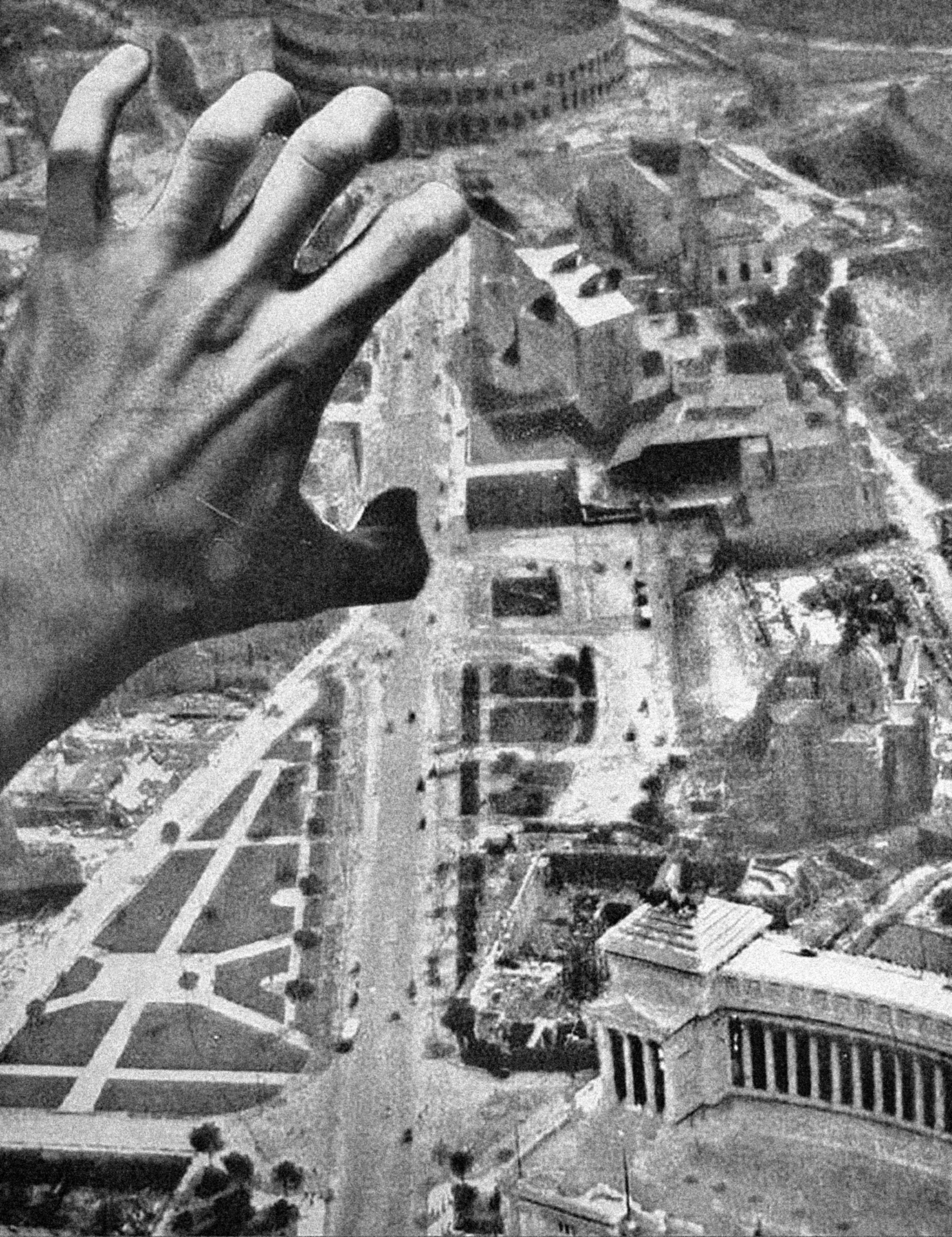 The various plans for the construction of a new “Imperial Rome” were surrounded by an open public debate. However, there was no question about the what, only about the how, as presented by the photo “Questo non lo permetteremo” [We Will Not Allow This] by Pietro Maria Bardi. Writer, curator, art critic Pietro Maria Bardi ran an art gallery financed by the National Fascist Syndicate of Fine Arts in 1930. In 1931 he wrote a famous report on architecture for Mussolini, and promoted the Italian Exhibition of Rationalist Architecture. Starting in 1933, together with Massimo Bontempelli, he directed the magazine Quadrante, dedicated to arts and architecture, with the collaboration of Le Corbusier and Giuseppe Terragni, among others. The short-lived cultural journal Quadrante transformed the practice of architecture in Fascist Italy. Over the course of three years (1933–36), the magazine agitated for an “architecture of the state” that would represent the values and aspirations of the Fascist regime, and in so doing it changed the language with which architects and their clientele addressed the built environment. The journal sponsored the most detailed discussion of what should constitute a suitably “Fascist architecture.” Quadrante rallied supporters and organized the most prominent practitioners and patrons of Italian rationalism into a coherent movement that advanced the cause of specific currents of modern architecture in interwar Italy. Starting in 1937, Bardi began to oppose Mussolini’s official architecture, in a controversy that became notorious in the Italian sociocultural milieu. After WWII he relocated with his wife, the architect Lina Bo Bardi, to Brazil, and eventually became the founding director of the São Paulo Museum of Art.