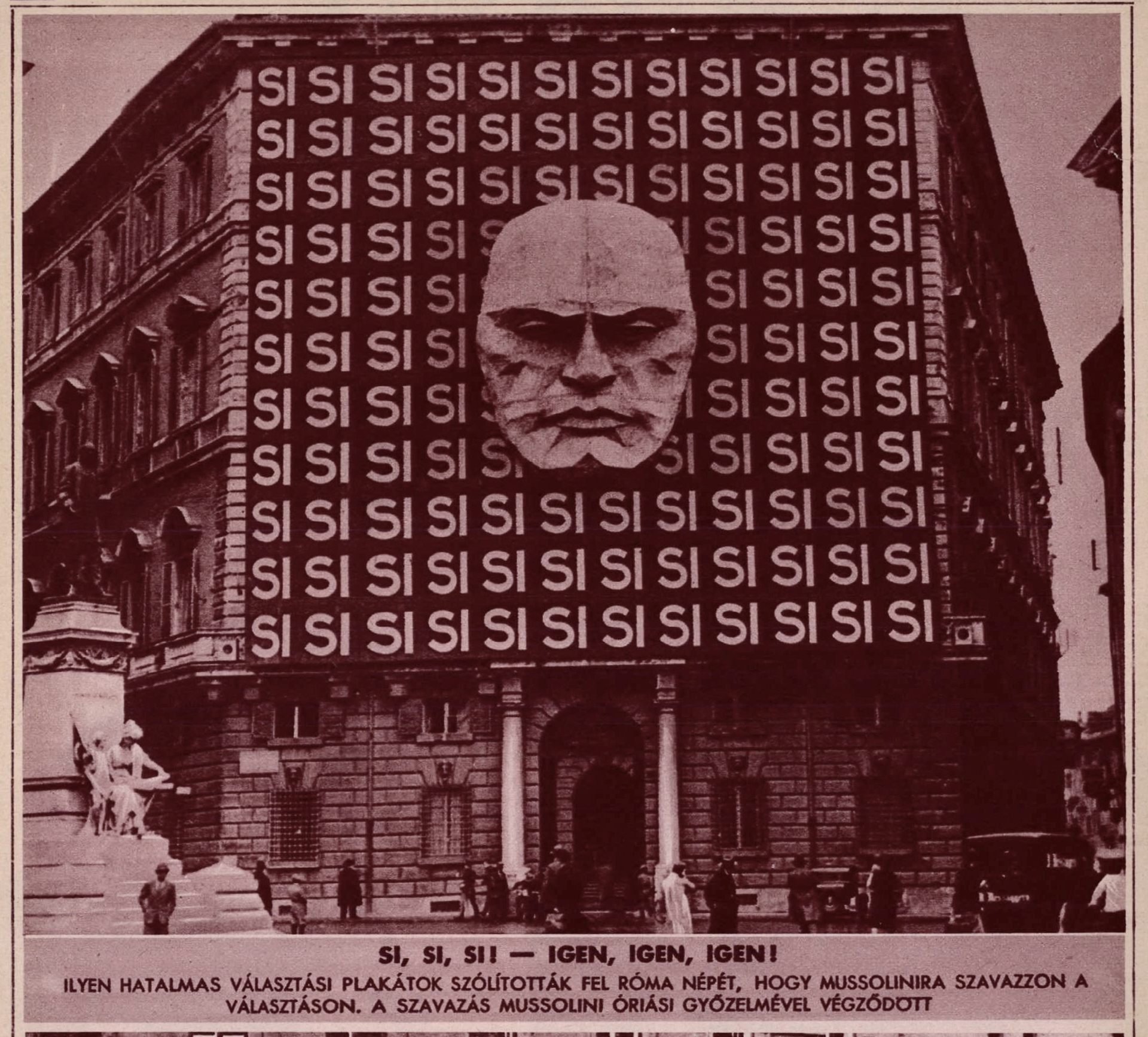 “Si, Si, Si! – Yes, Yes, Yes! Such huge election posters called on the people of Rome to vote for Mussolini during the elections; the vote ended with a huge victory for Mussolini.”