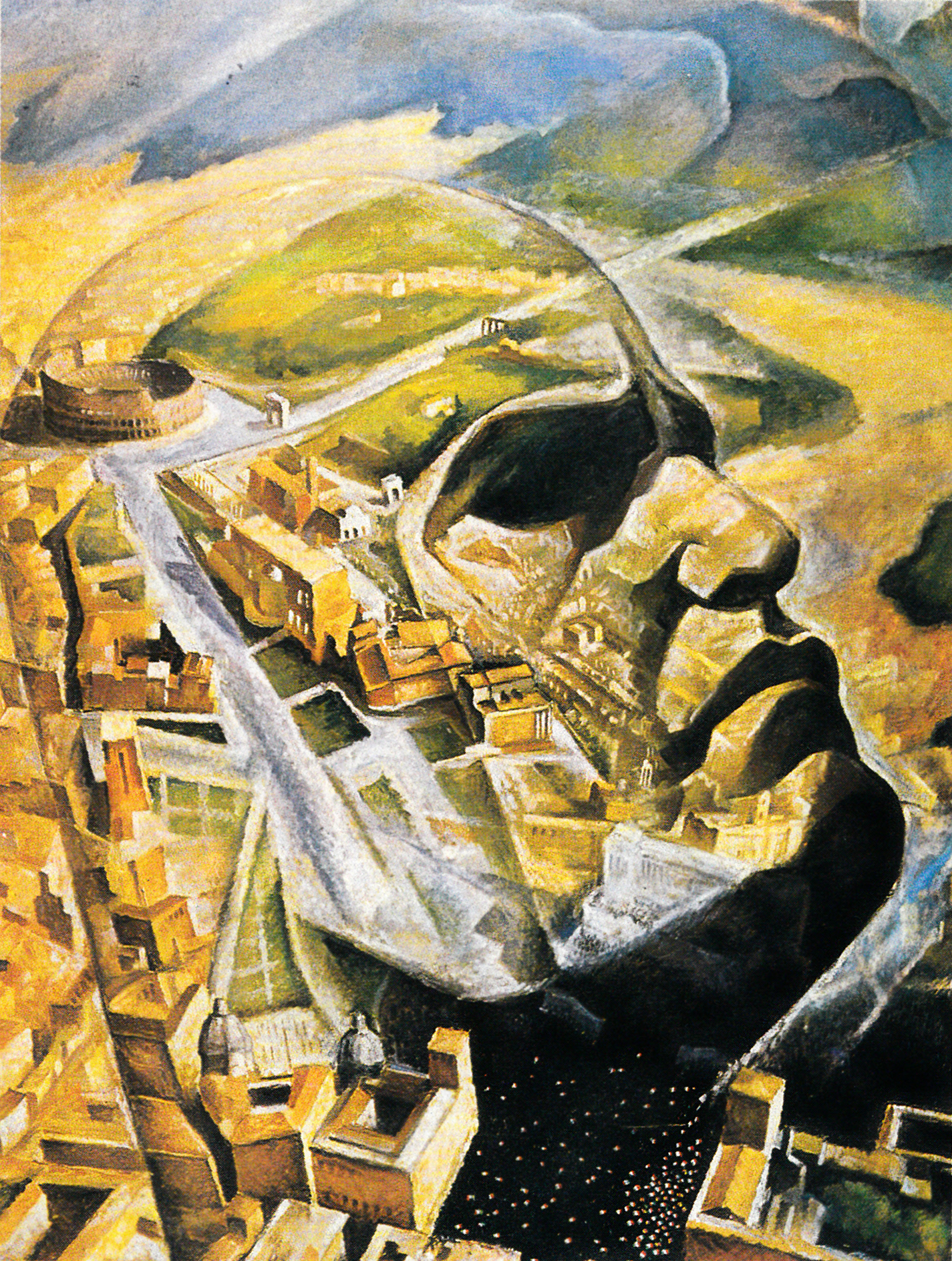 The mythical status of the City of Rome and its symbolic resonance had been part of the Italian, indeed the European, psyche since the time of the Roman Empire. By the time of the war in Ethiopia (1935–1936) and the creation of the new Italian empire, the concept of romanità had become central to Fascist propaganda. In unison with the literal unearthing of Italy’s past, the regime set about constructing the new Italy, both practically and metaphorically. Romanità found direct expression in the pared-down columns and triumphal arches of such monumental neoclassical edifices as Marcello Piacentini’s Palazzo delle Corporazioni in Rome. The paintings and sculptures of these years reflected the influence of romanità when they formed an integral part of architectural public commissions, such as the heroic statuary of the Stadio dei Marmi [Stadium of the Marbles] around the Foro Mussolini (designed by Enrico del Dobbio), or in the large-scale murals in public buildings such as ministries, post offices and railway stations.