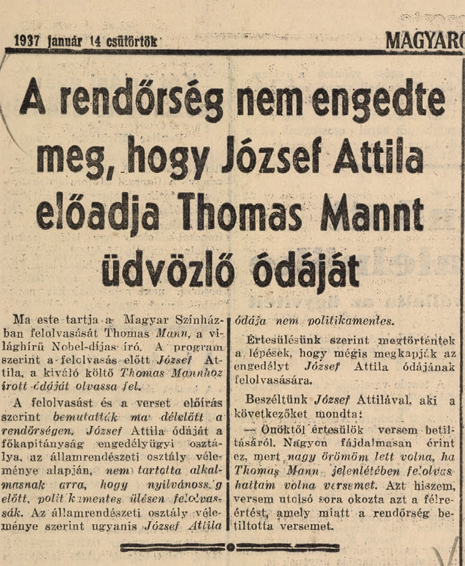 “The police did not allow Attila József to perform his ode to Thomas Mann”, 1937