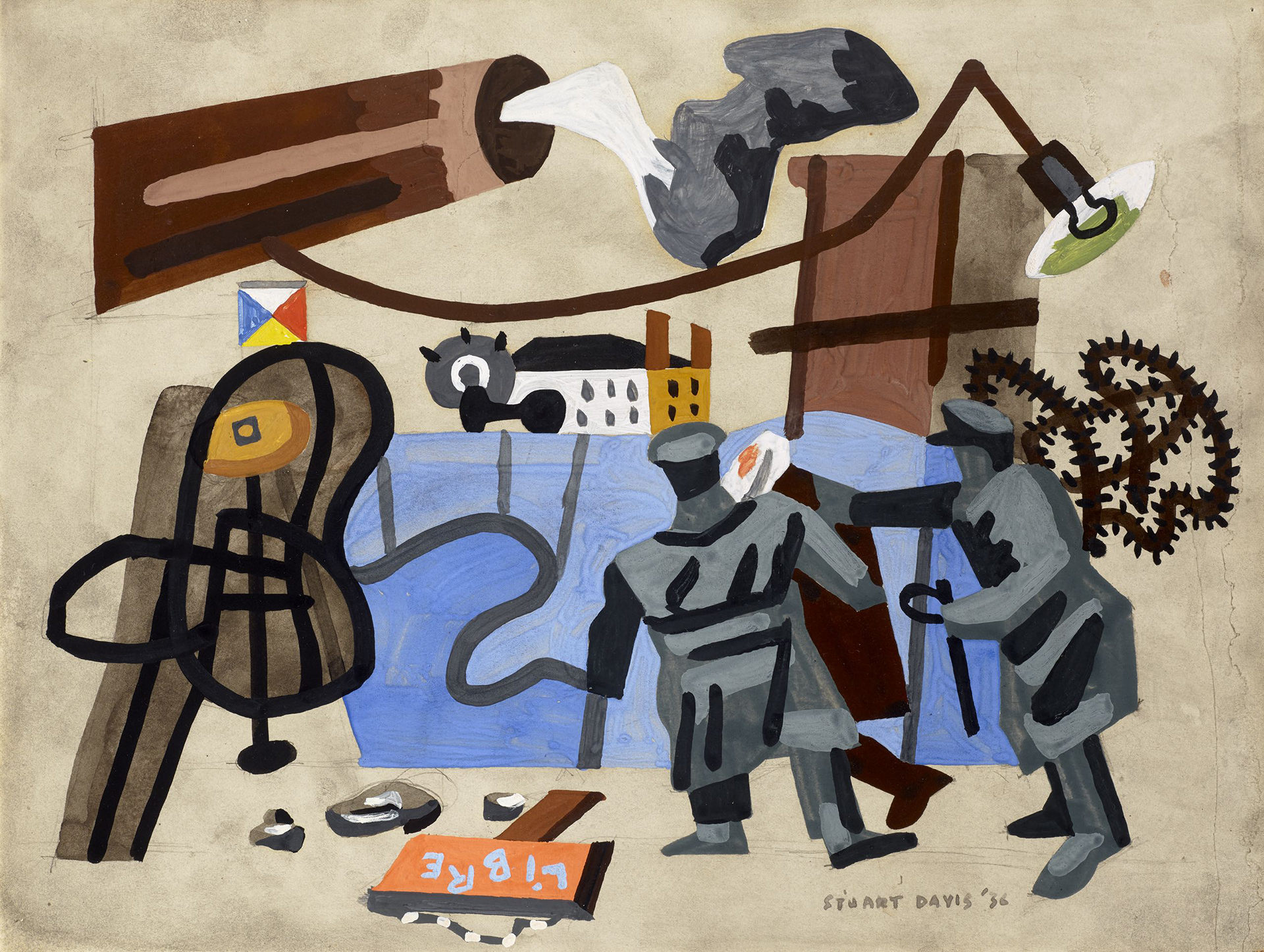 Stuart Davis’ artistic sensibility was formed early on by the revolutionary Armory Show of 1913. By the 1930s, Davis was already a famous American painter, but that did not save him from feeling the negative effects of the Great Depression, which led to his being one of the first artists to apply for the Federal Art Project. Under the project, Davis created some seemingly Marxist works; however, he was too independent to fully support Marxist ideals and philosophies. Despite several works that appear to reflect the class struggle, Davis’ roots in American optimism were apparent throughout his lifetime. He was active in the Unemployed Artists Group, became vice president of the Artists’ Union, and was editor of the organization’s journal Art Front and vice president and then president of the American Artists’ Congress. His paintings in the early 1930s were enlivened with quickly recognizable images of street signs, garage pumps, dock scenes and the New York cityscape.