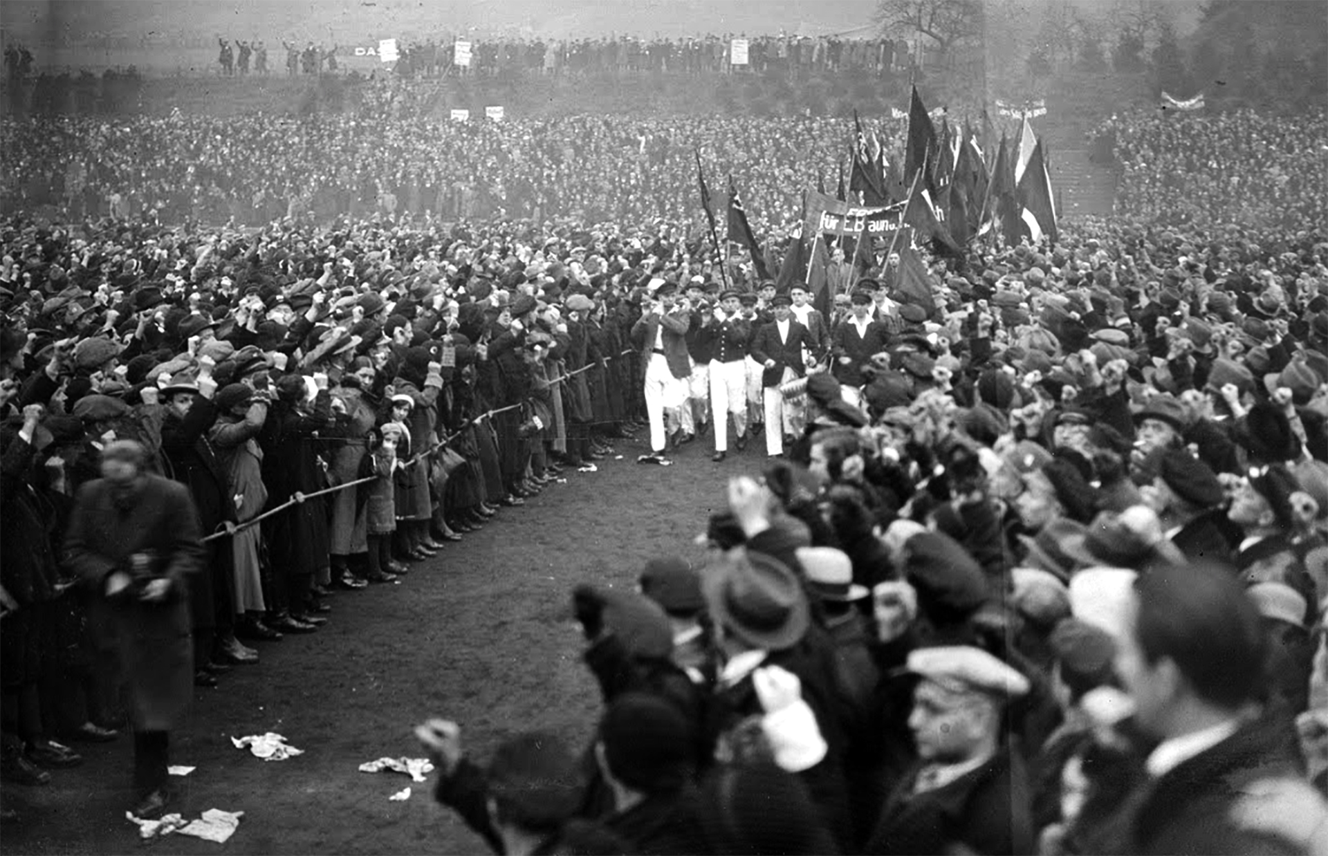 Anti-fascist demonstration in the Saar, during the Saar voting campaign. 60,000 anti-fascists assembled to show people that Hitler meant war, 1934