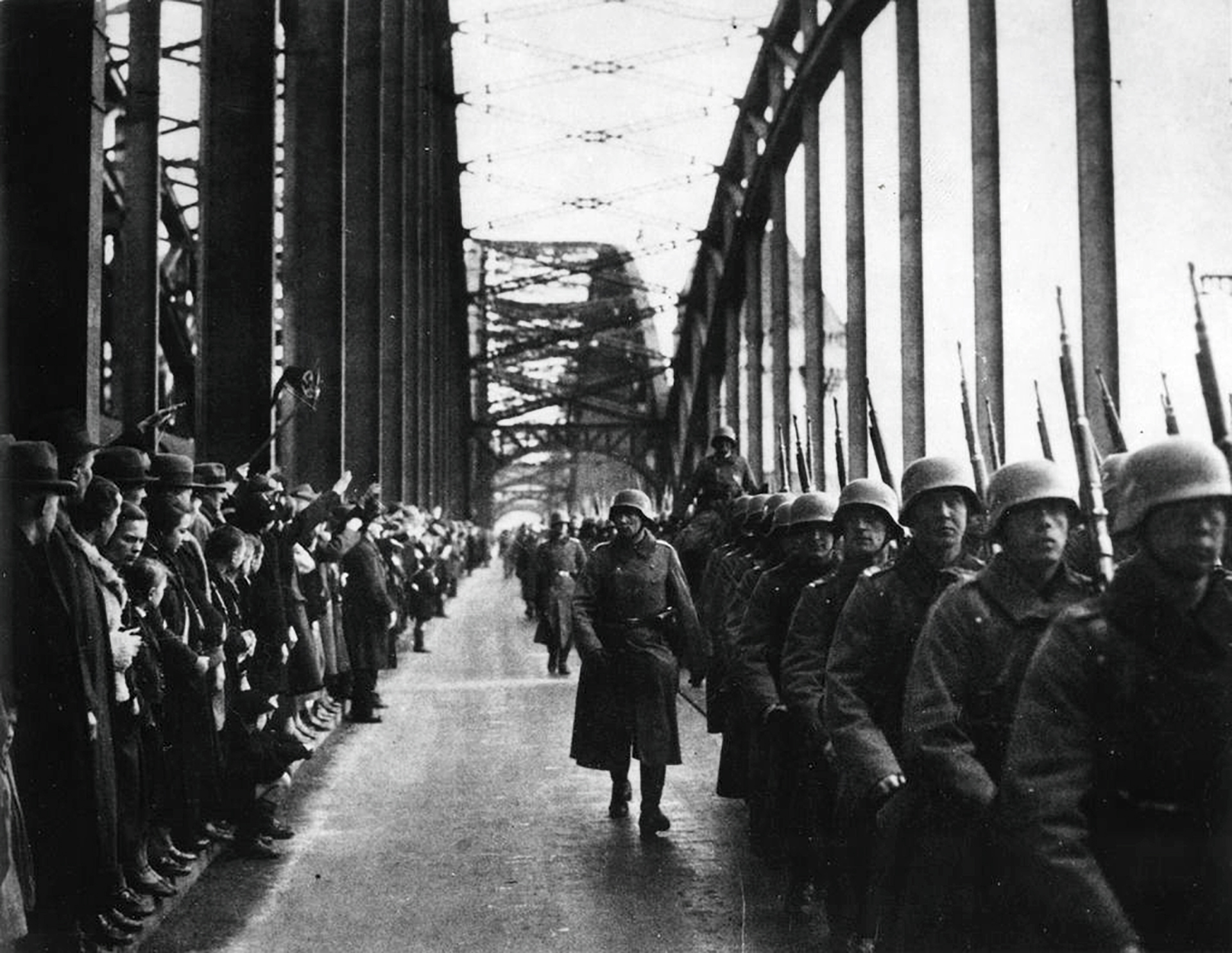 On March 7, 1936, a total of 30,000 Wehrmacht soldiers crossed the bridges over the Rhine and thus began the German invasion of the demilitarized Rhineland. They set up garrisons in Aachen, Trier and Saarbrücken. With the occupation of a 50 km wide zone, the German Reich broke both the Versailles Treaty of 1919 and the Locarno Pact of 1925. Adolf Hitler justified the breach of the treaties by referring to the German right to self-determination and to the so-called Franco-Soviet Treaty of Mutual Assistance, which he described as a breach of the Locarno Pact. The occupation was extremely risky: a military reaction by the Western powers would have forced the German troops to withdraw immediately. Fascist Italy, however, had already promised in advance that it would not take part in international actions. France refrained from invading because it did not have the support of Great Britain. Foreign countries contented themselves with harsh verbal criticism and condemnation of Germany before the League of Nations. With reference to Alsace-Lorraine, Hitler claimed on March 7th that he had no territorial claims against France. He offered his western neighbors non-aggression pacts and Germany’s return to the League of Nations, but his weak proposals were not accepted. Once again Hitler succeeded in his policy of exploiting the differences between the Western powers, and a combination of peace-loving rhetoric and aggressive measures. In the German Reich, the occupation of the Rhineland meant an enormous gain in prestige for Hitler and reinforced his assumption that the states of Europe would tolerate his expansion policy.