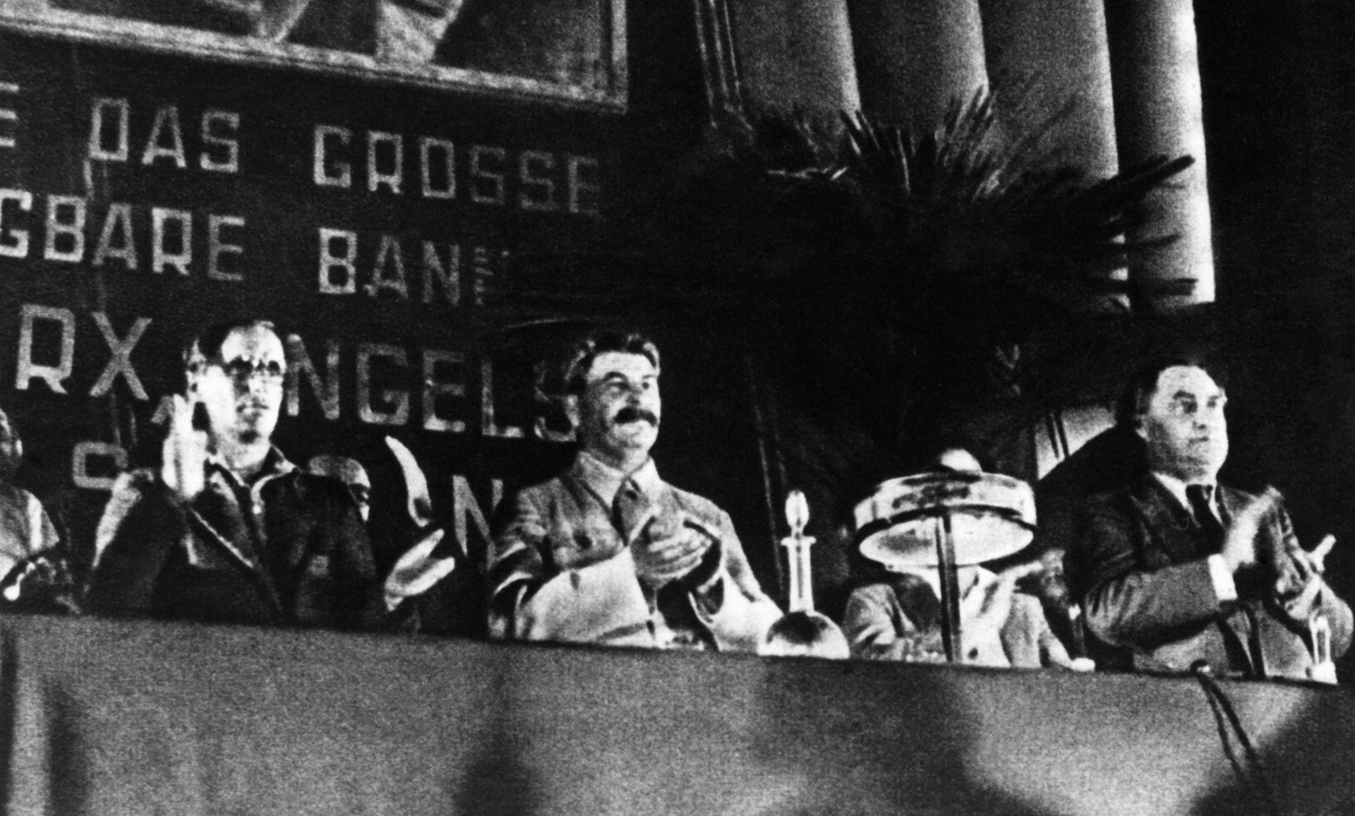 The 7th World Congress of the Communist International (Comintern): John Ross Campbell, Joseph Stalin and Georgi Dimitrov, the latter was appointed General Secretary at the 1935 Congress, 1935
