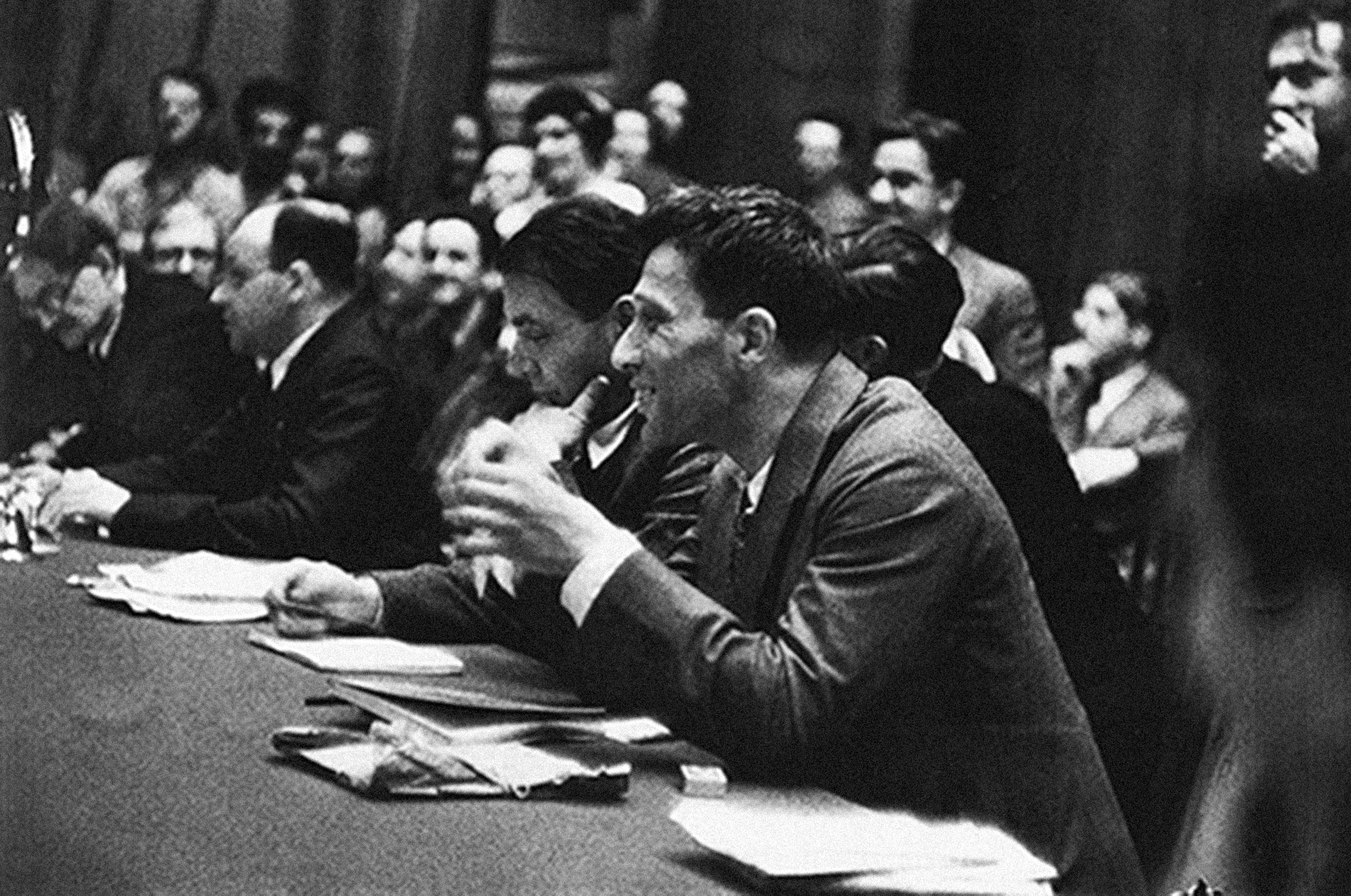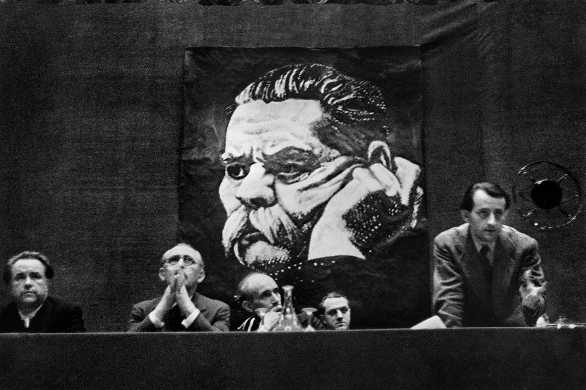 (from the left) Paul Vaillant-Couturier, André Gide, Jean Richard Bloch, speaking: André Malraux.