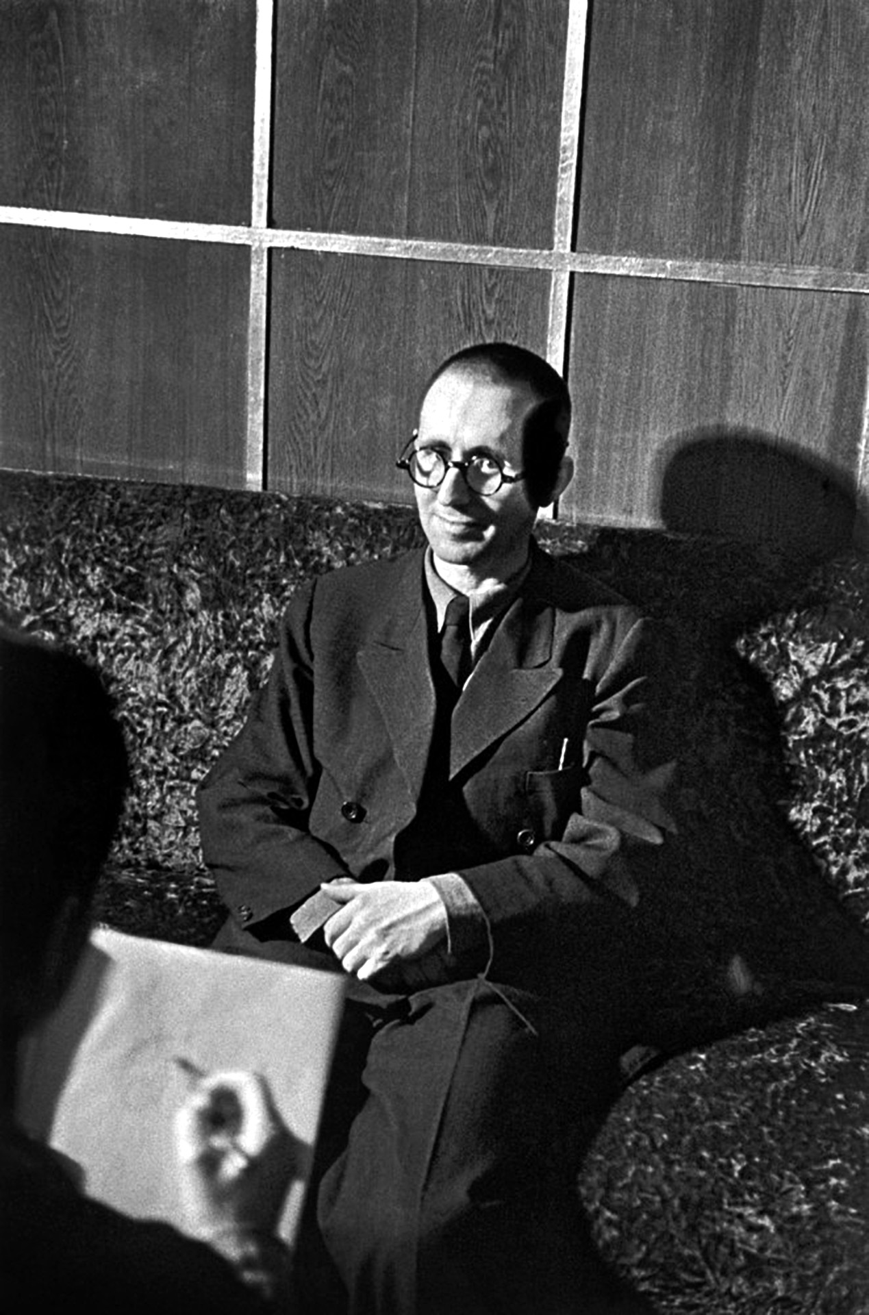 David Seymour “Chim” [Dawid Szymin], German poet and playwright Bertolt Brecht having his portrait drawn at the First International Congress of Writers for the Defense of Culture at the Palais de Mutualité, Paris, France, 1935