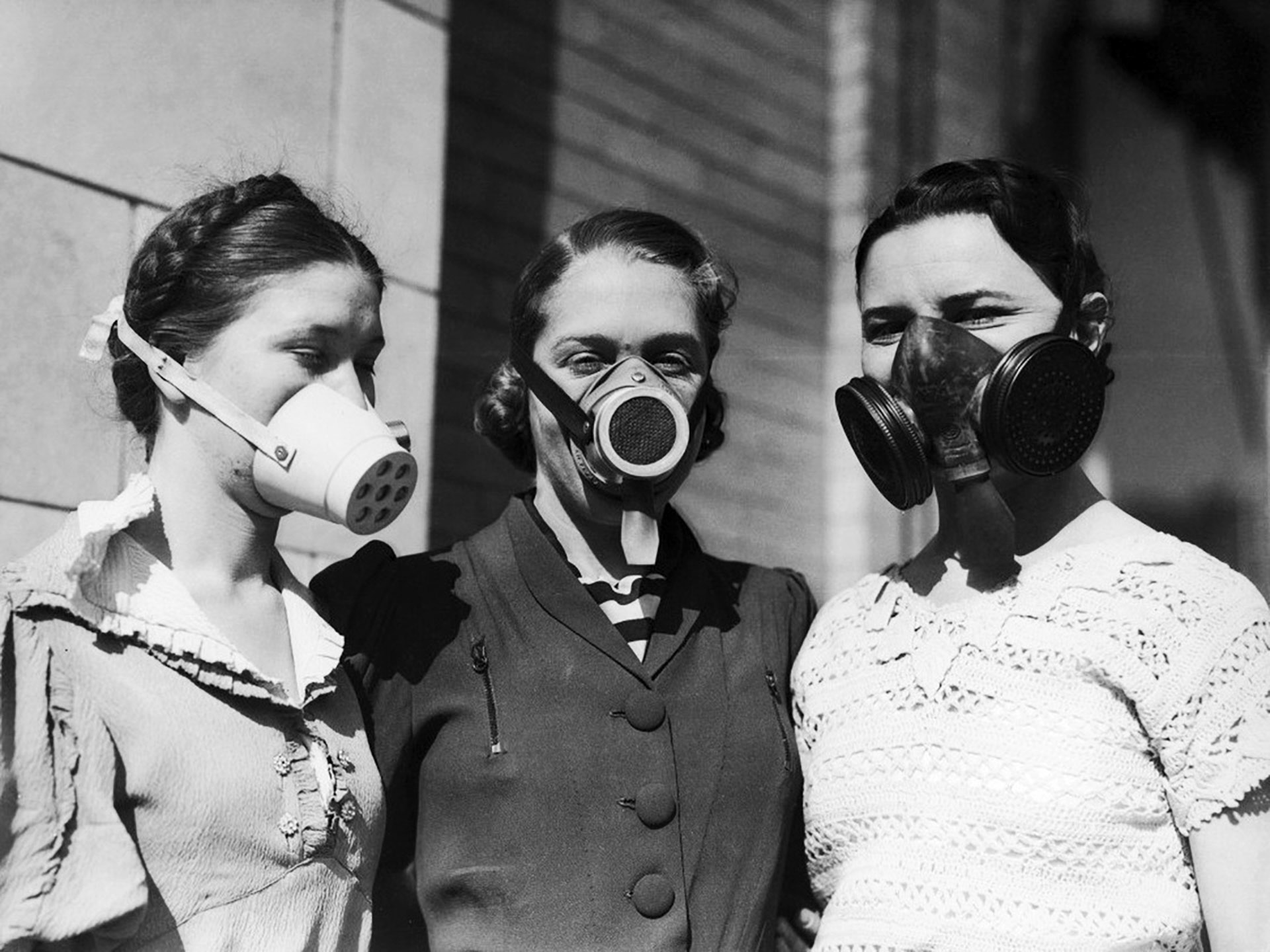 Young women model masks worn during America’s Dust Bowl disaster, circa 1935