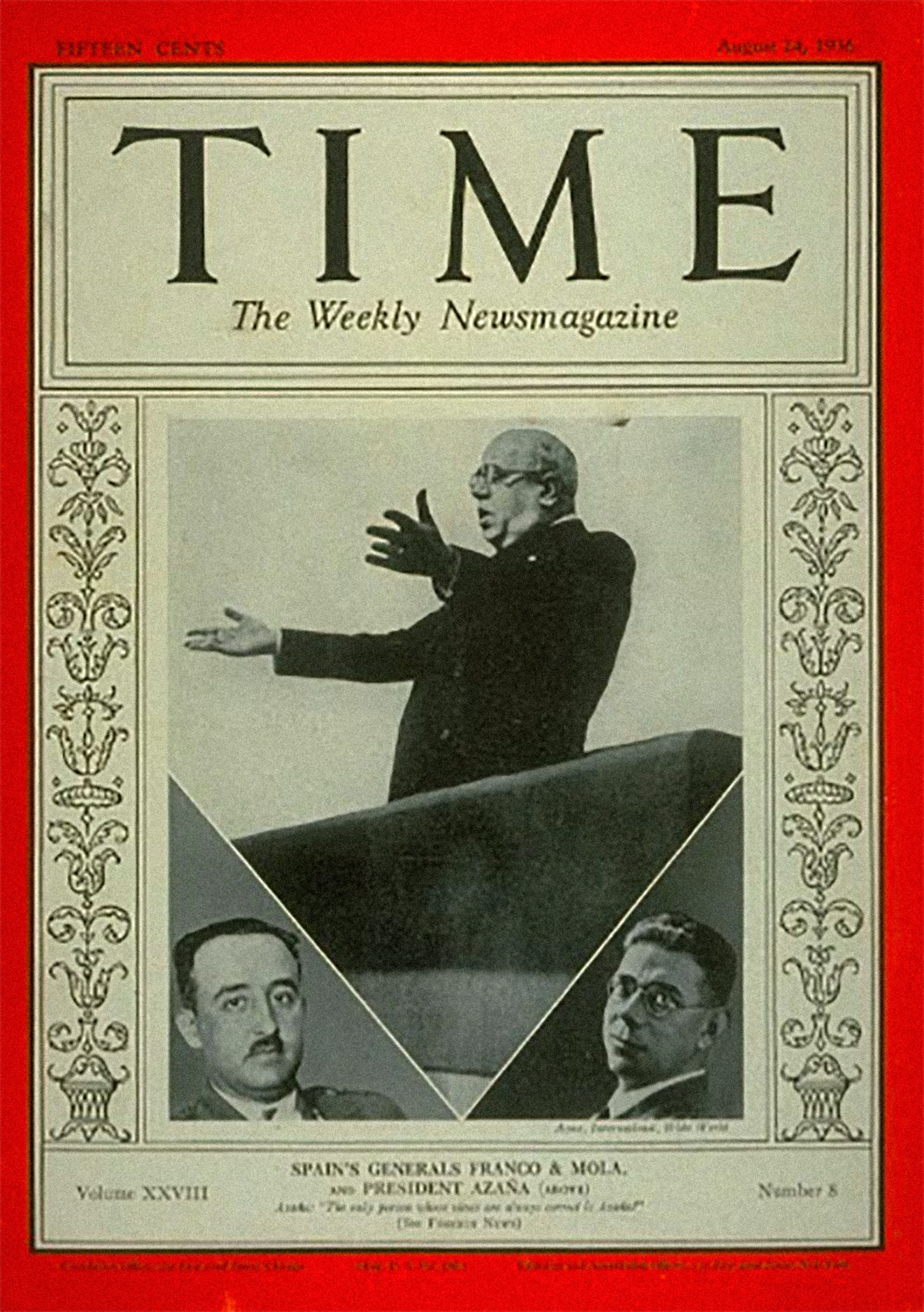 Cover of Time Magazine: (from left to right) Spanish General Francisco Franco, President Manuel Azaña and General Emilio Mola, August 24, 1936
