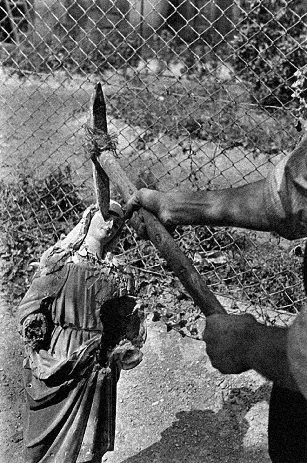 David Seymour “Chim” [Dawid Szymin], Arson attacks on churches and monasteries were common during the first days of the civil war. Militias were created in order to preserve the artistic and cultural heritage of Spain from radical anticlerical outbursts. Their mission was to protect churches, museums and libraries. Barcelona 1936