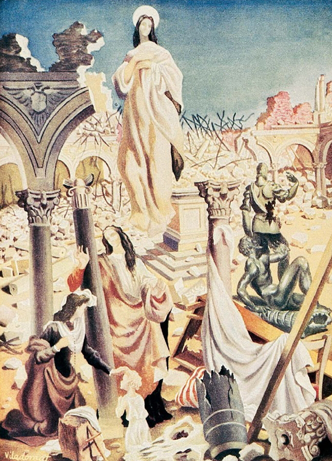 It was not only people who perished during the war. Many historical monuments as well as artworks also fell victim to the violence. In the early days of the civil war, anti-clerical sentiment reached its peak when it became clear that the Francoist uprising was backed by the Church. Churches and monasteries were attacked and set on fire. The Republicans set up militias in order to preserve the artistic and cultural heritage of Spain from radical anticlerical outbursts. The Nationalist propaganda used these attacks against the Republic throughout the civil war, claiming an alleged lack of concern for culture on the Republican side—even though it was the Republicans who organized the protection of artworks of the Prado Museum. An early cultural clash came at the beginning of the civil war, with the siege of the Alcázar in Toledo. This medieval citadel was used as an academy for elite officers, all of whom supported Franco; a group of nationalist soldiers and some civilians took refuge there and successfully sustained a protracted Republican siege during which the famous national monument was subjected to heavy bombing and shelling. By a historical fluke, the supporters of a military coup, the insurrectionists, could thus be depicted as engaged in heroic resistance, and the republican/national opposition appeared in terms of destruction/protection. In the official history of the war written immediately after Franco’s victory, the Alcázar incident featured not only as a chapter of military history but with a special emphasis on the “destruction of the artistic treasure of Toledo”. In a sumptuously illustrated book, the Laureados de España 1936–1939 [Laureates of Spain], in honor of nationalists recipients of the Cruz Laureada de San Fernardo for heroism, slightly surreal imagery was used for its capacity to mythologize the events through visual associations. Domingo Vildomat’s image for the Los héroes del Alcázar [Heroes of the Alcázar] focuses on the destruction of the monument by the Republicans: an accusing El-Greco-like Madonna hovers over the ruins.
