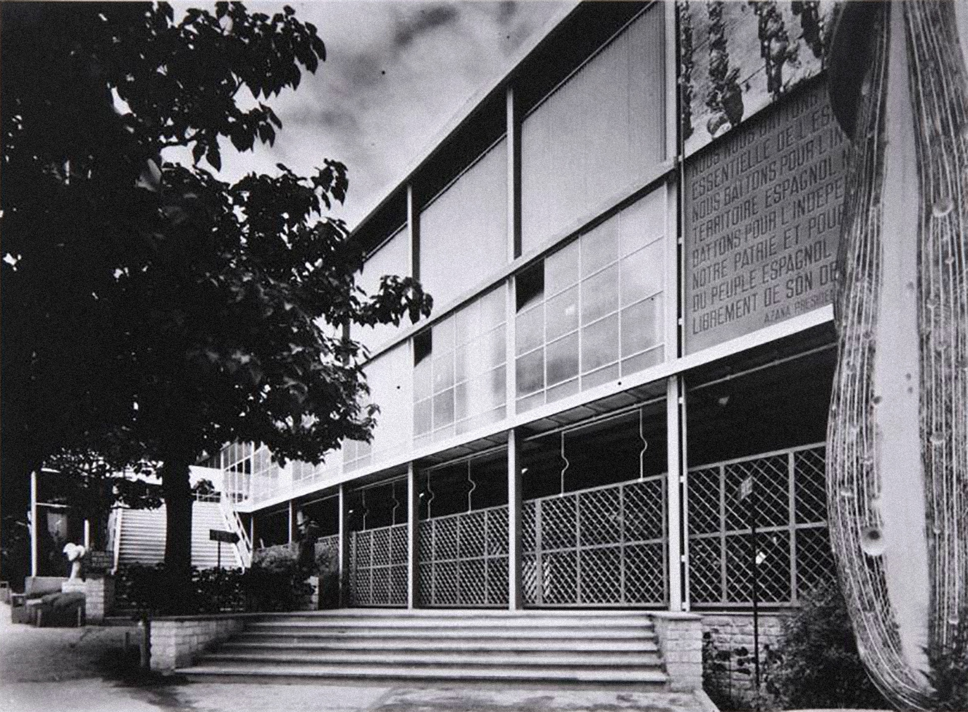 Another major cultural feat of the Republic during the war was its participation in the International Exhibition in Paris in 1937, where the Spanish Republic set up a national pavilion entirely devoted to propaganda. In itself, this would not have been unusual. But instead of displays of industrial and commercial achievements, the Republic chose to represent itself entirely through art and culture. The fact that Spain was in the midst of a civil war with severe disruptions to commerce must to some degree have been responsible for this. The organizers made every effort to show that the government was in control and to counter nationalists claims that Spain had become dangerously destabilized by the Left. They were convinced that a successful participation in such an international event as the Paris Exhibition would raise the standing of the Republican movement and bring tangible benefits in its train. It was the aim of the Spanish Pavilion to draw attention to the ravages of civil war in Spain and to elicit direct support for the Republic. The pavilion was designed by Josep Lluis Sert (the nephew of the painter José María Sert), who was a disciple of Le Corbusier and a founding member of the Catalan rationalist GATCPAC [Grup d’Arquitectes i Tècnics Catalans per al Progrés de l'Arquitectura Contemporània, Catalan Architects and Technicians for the Progress of Contemporary Architecture] group. Sert worked together with Luis Lacasa, who had previously worked for the Republican government on Madrid’s University City project. The pavilion was a light, unostentatious elegant exercise in rationalist architecture. It stood on the main avenue linking the Trocadéro with the Eiffel Tower in the center of the foreign section, where it occupied a highly visible, though relatively small site. Its simple structural exterior was almost self-effacing, in contrast to the attention-seeking German and Soviet pavilions that glared at each other across the approach to the Pont d’Iéna.