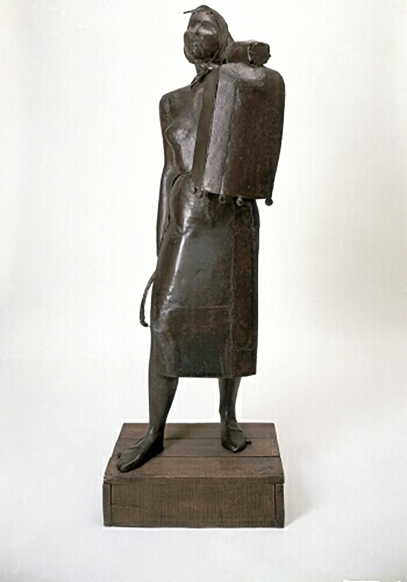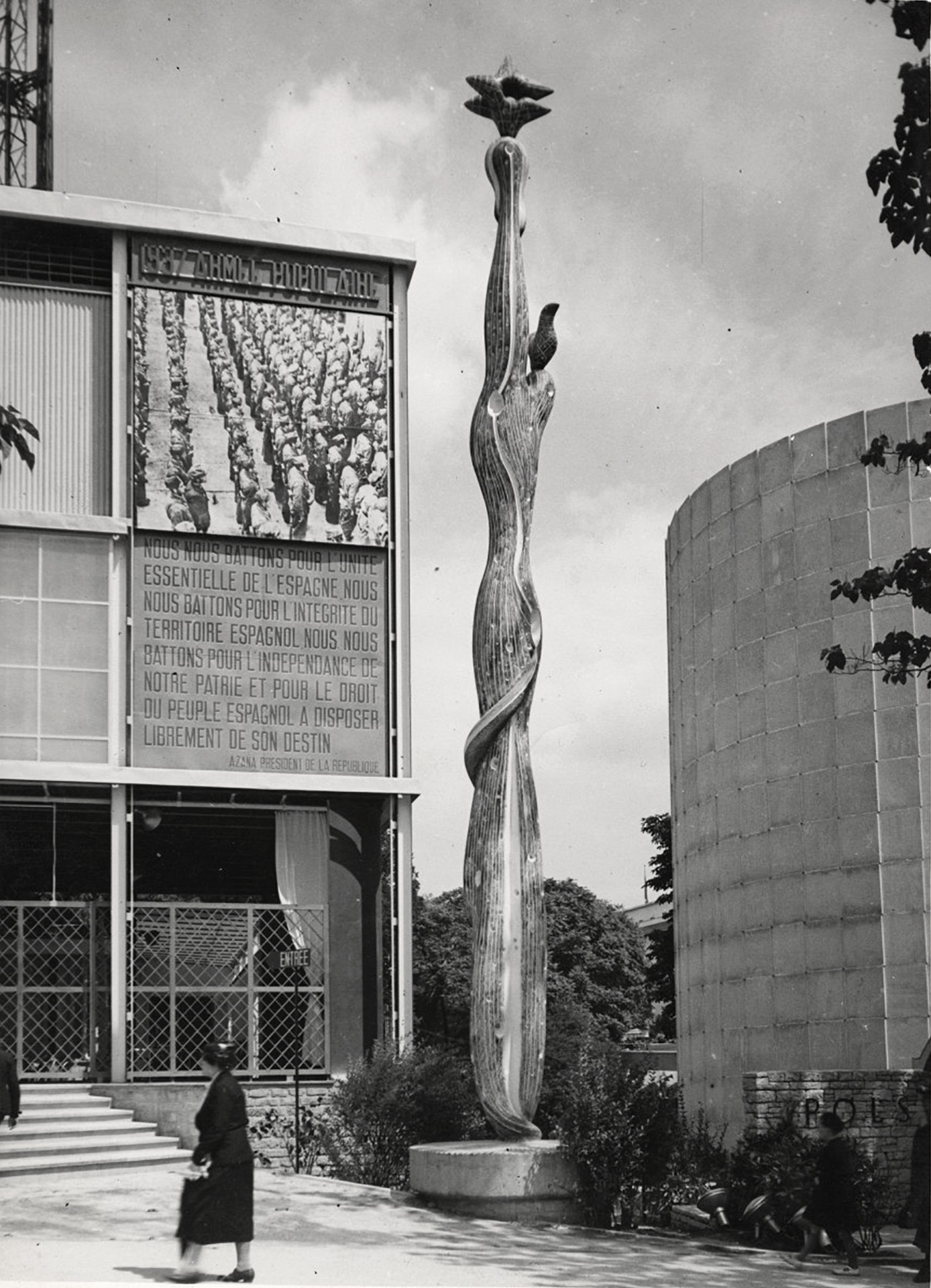 Julio González, a friend of Picasso from his symbolist Barcelona days at Els Quatre Gats, who was also residing in Paris at the time, presented the sculpture Montserrat outside the pavilion on the ramp. Started as a piece about motherhood, the sculpture later gained political significance as a result of the Spanish Civil War. The title is a reference to the mountain of Montserrat near Barcelona, a traditional symbol of the sculptor’s native Catalonia. González, who came from a family of workers in precious metals, was taught to work with metal at an early age and later learned industrial welding at the Renault factory. González pioneered welding techniques in sculpture and also guided Picasso decisively in the field of wrought-iron sculpture. His works came to reflect his pessimistic reaction to the war. “It is high time that this metal ceased to be a murderer and the simple instrument of an overly mechanical science. Today, the door is opened wide for this material to be—at last!—forged and hammered by the peaceful hands of artists.” Montserrat is a symbol of universal pain; a sublime work that is more figurative and dramatic than González’s other works; a personal way for its author to reconcile his Cubist heritage with his bitter sentiments over the fate of Spain.