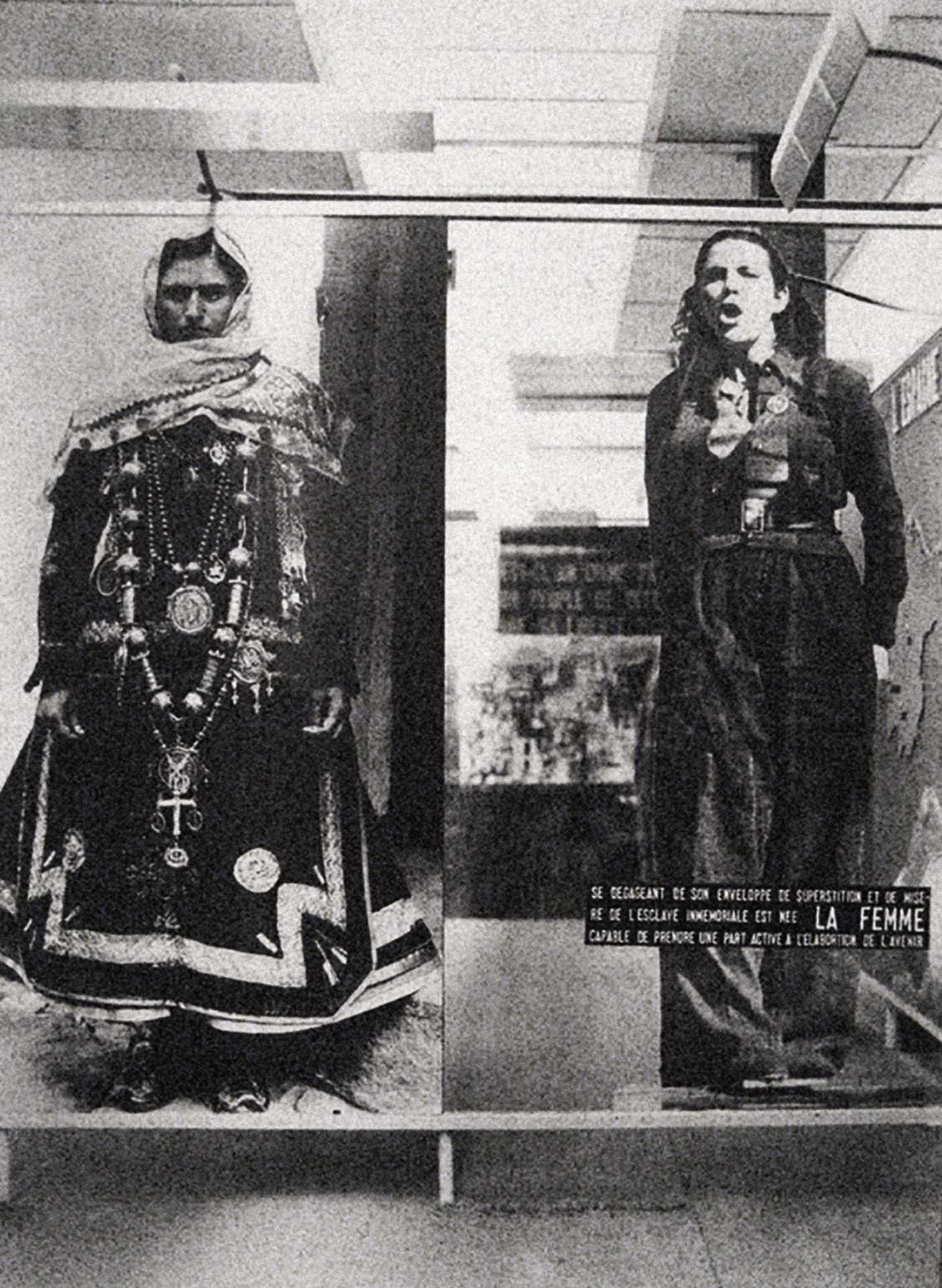 A key element in the pavilion’s scenery was the series of photomontages created by or under the supervision of Josep Renau. Renau, an important figure in the Spanish Communist Party (PCE), was General Director of Fine Arts [Director general de Bellas Artes] from September 1936 onwards. In this position, he appointed Picasso, in a symbolic gesture, as the director of the Prado Museum. During the Second Republic, in his magazine Nueva Cultura [New Culture], and other left-wing media he created a series of political photomontages, and his mastery of the medium, as well as his experience in presenting complex political and social issues in an impressive manner, strongly influenced the displays of the Spanish Pavilion. The panels covered such topics as literacy programs, the provision of schools and hospitals, and help for infants and war widows, as well as the roles of industry and agriculture, and the effects of warfare on Spanish cities. In one of the most striking examples, the role of women in the new society was represented in a photomontage that juxtaposed two life-size images on a “before and after” double panel. The caption left no room for doubt about the changing role of women: “Freeing herself from her wrapping of superstition and misery, from the immemorial slave is born THE WOMAN, capable of taking an active part in the development of the future.” As General Director of Fine Arts, Renau was not only the main commissioner of the Spanish Pavilion, he was also responsible for the evacuation of the Prado Museum. After the Spanish Civil War Renau went into exile in Mexico and later settled in the German Democratic Republic.