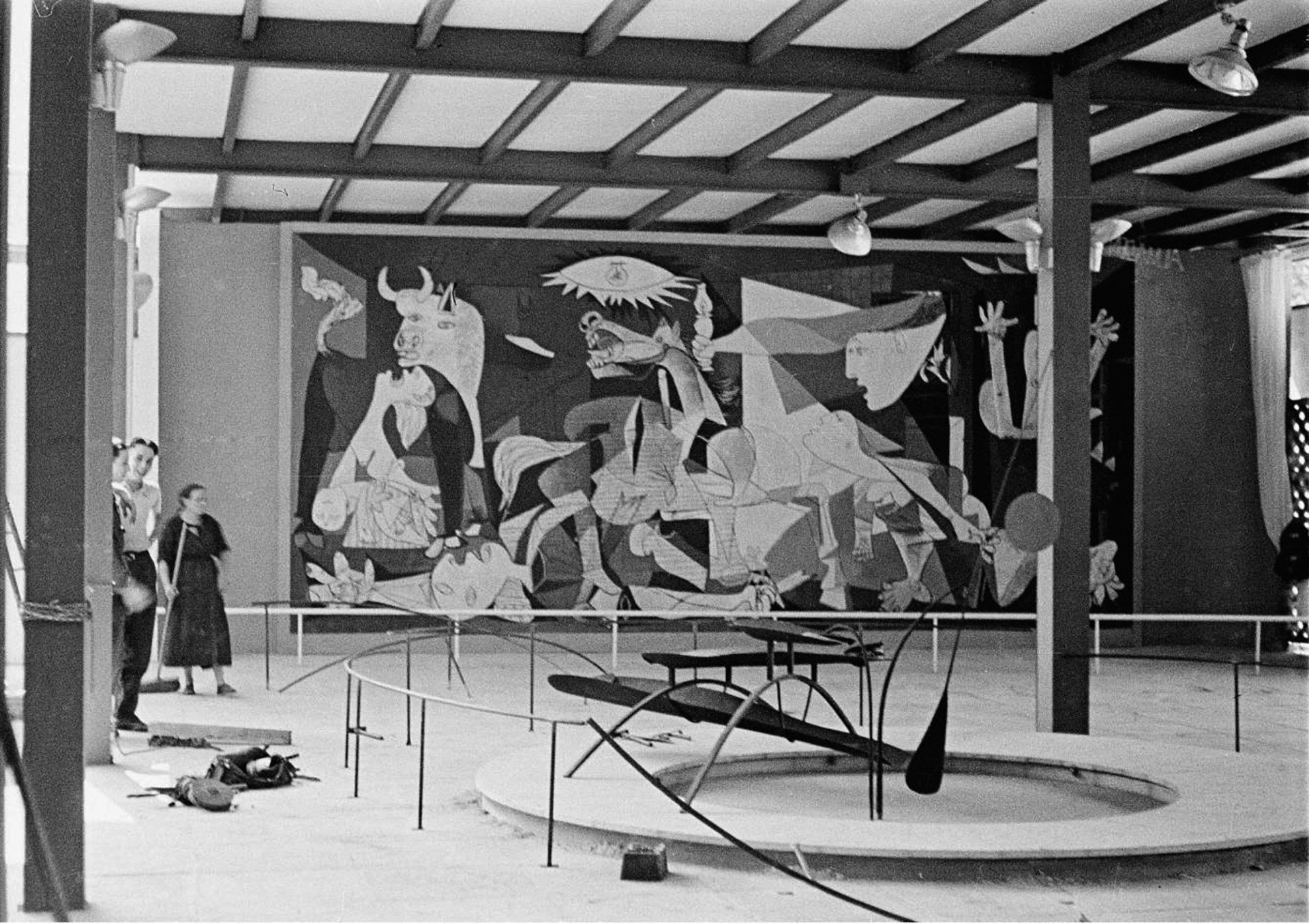 François Kollar [Frantisek Kollar/Kollár Ferenc], Picasso’s Guernica displayed in the Spanish Pavilion at the International Exhibition in Paris, with Alexander Calder’s Mercury Fountain in the foreground, 1937