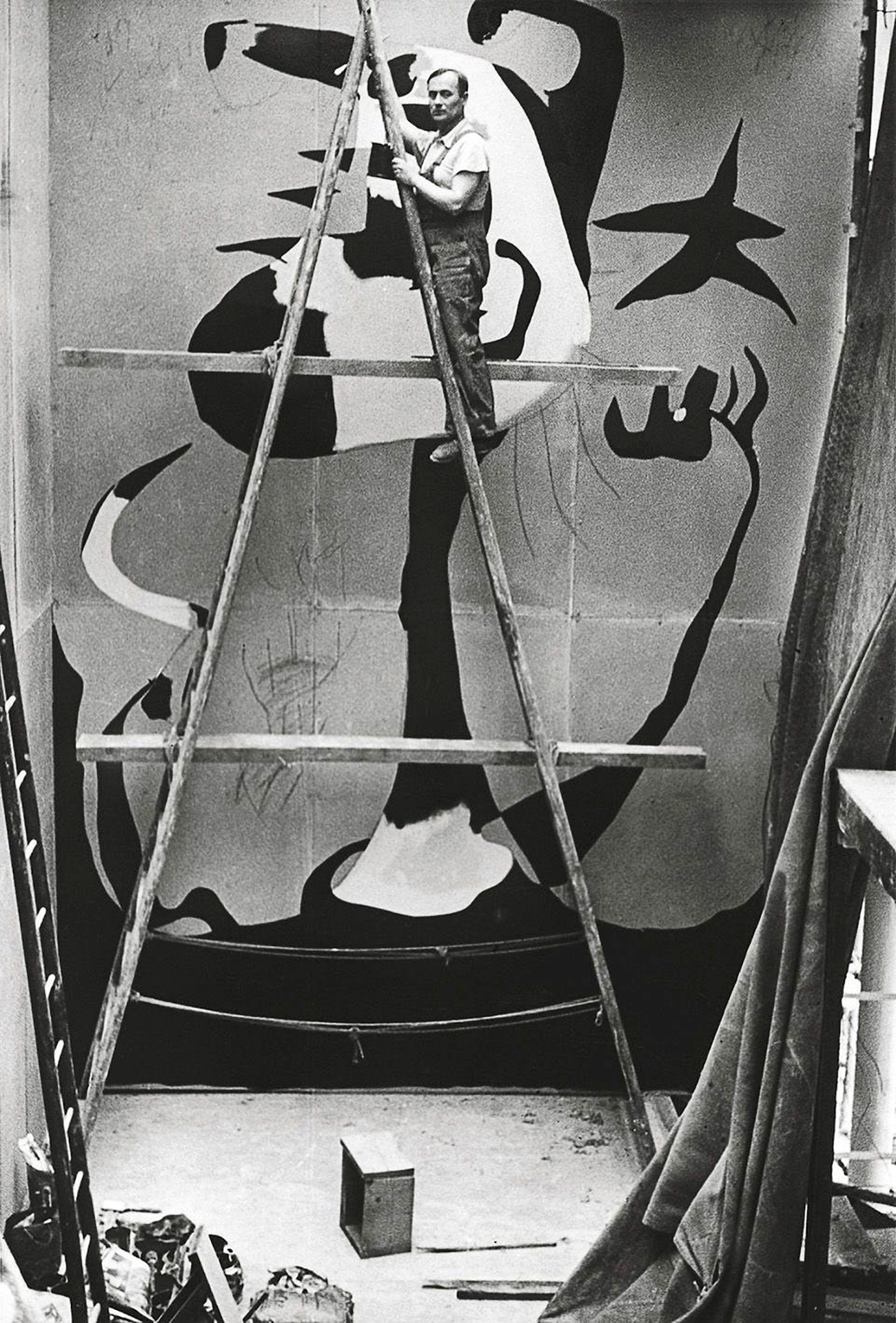 Joan Miró working on his mural El segador [The Reaper], in the Spanish Pavilion at the International Exhibition, Paris, 1937
