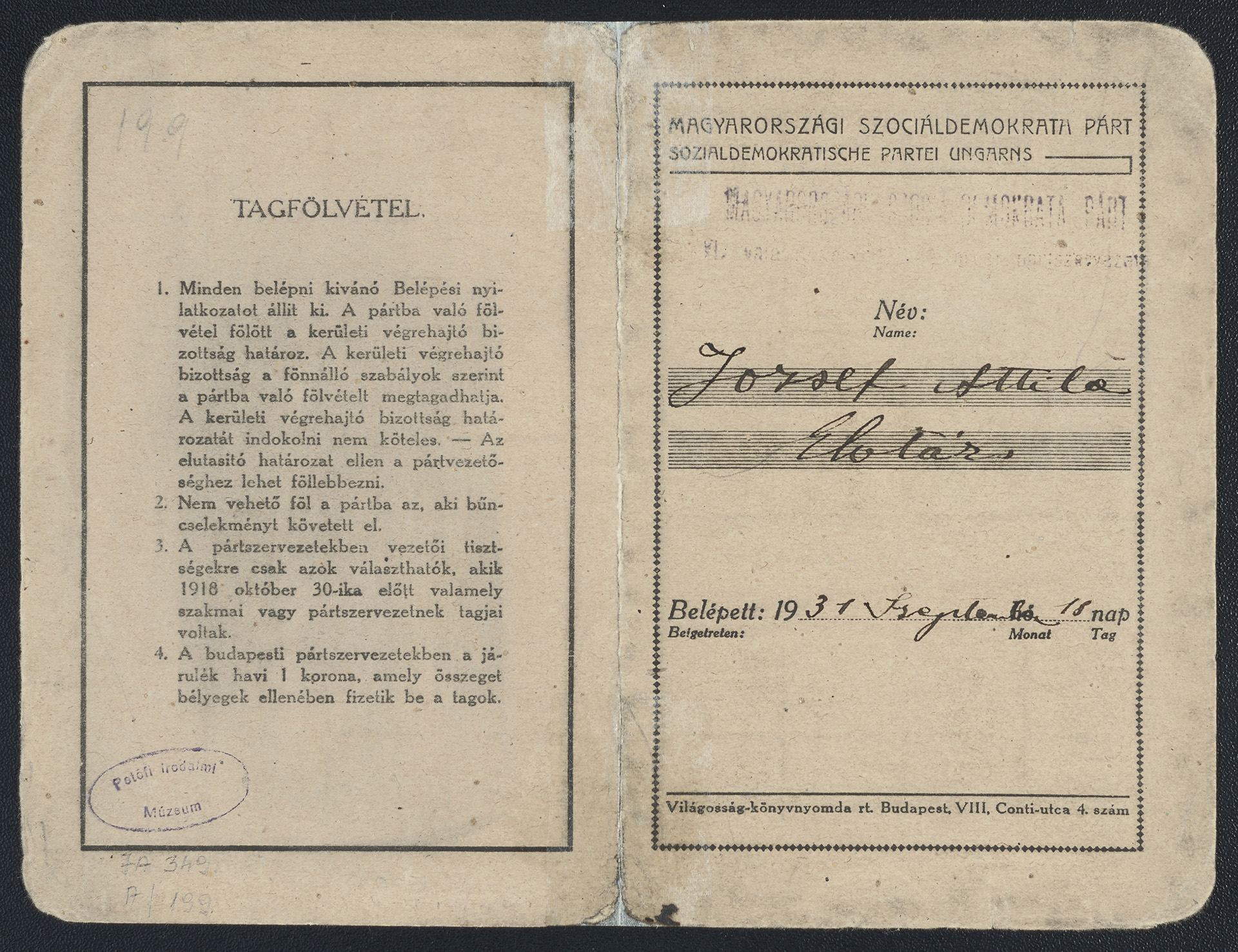 Membership card of the Magyarországi Szociáldemokrata Párt, [MSZDP, Hungarian Social Democratic Party] for Attila József, 18 September 1931
