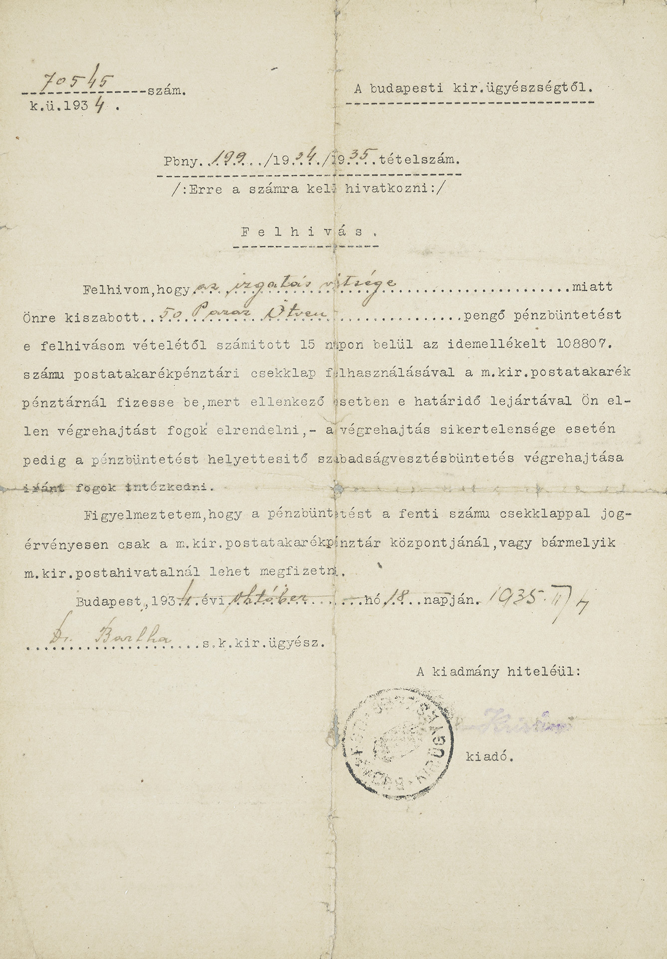Documents of the press trial for Attila József’s poem Lebukott [Busted], 1934–35