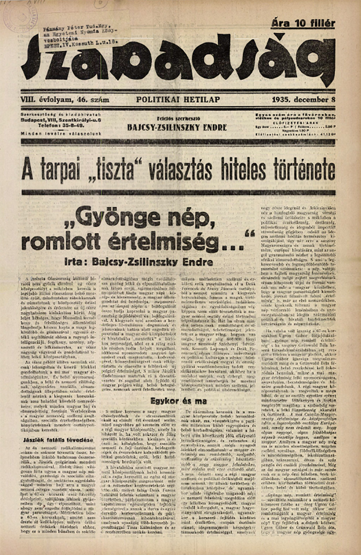 Endre Bajcsy-Zsilinszky, „A tarpai ‘tiszta’ választás hiteles története. Gyöngye nép, romlott értelmiség…”, [An authentic story of Tarpa’s ‘clean’ election. Weak people, depraved intellectuals…], Report of the weekly, Szabadság (which was edited by Bajcsy-Zsilinszky himself) on the Tarpa election, December 8, 1935
