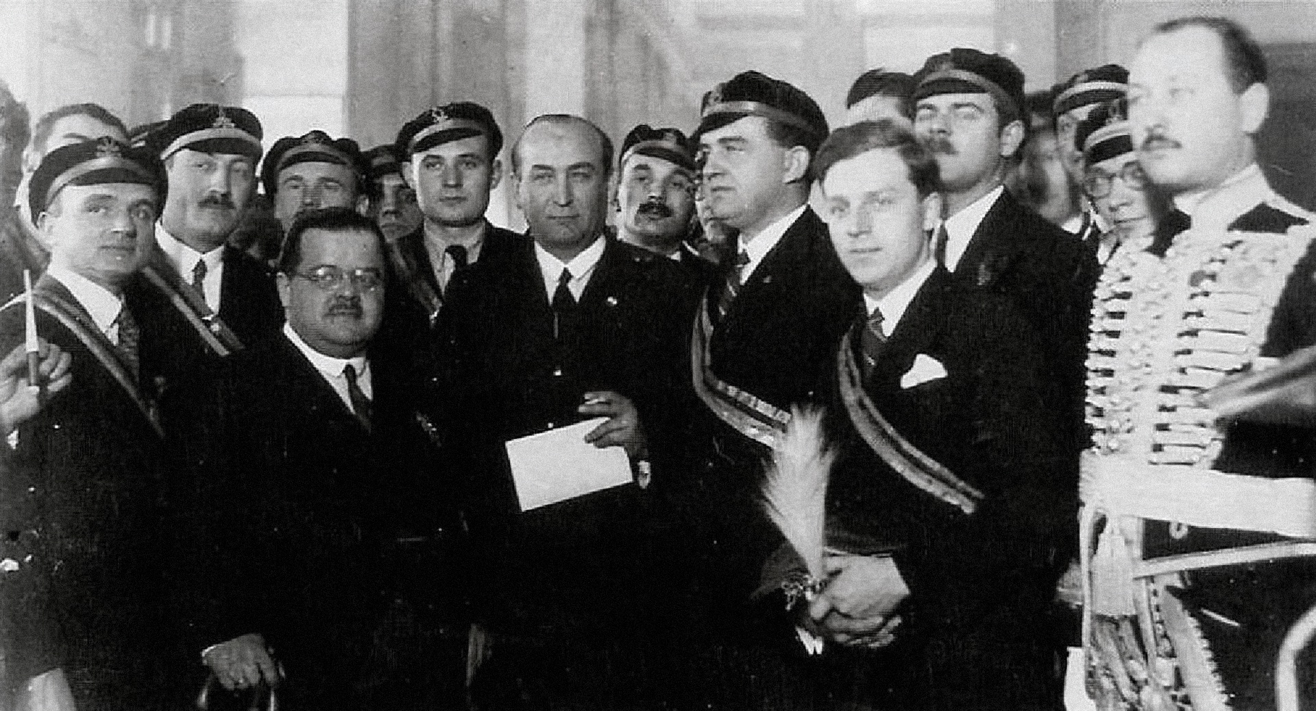 Prime Minister Gyula Gömbös (in the middle) with the leaders of the Turul Association (The main leader of the Association, József Végváry is standing to Gömbös’s left), 1933