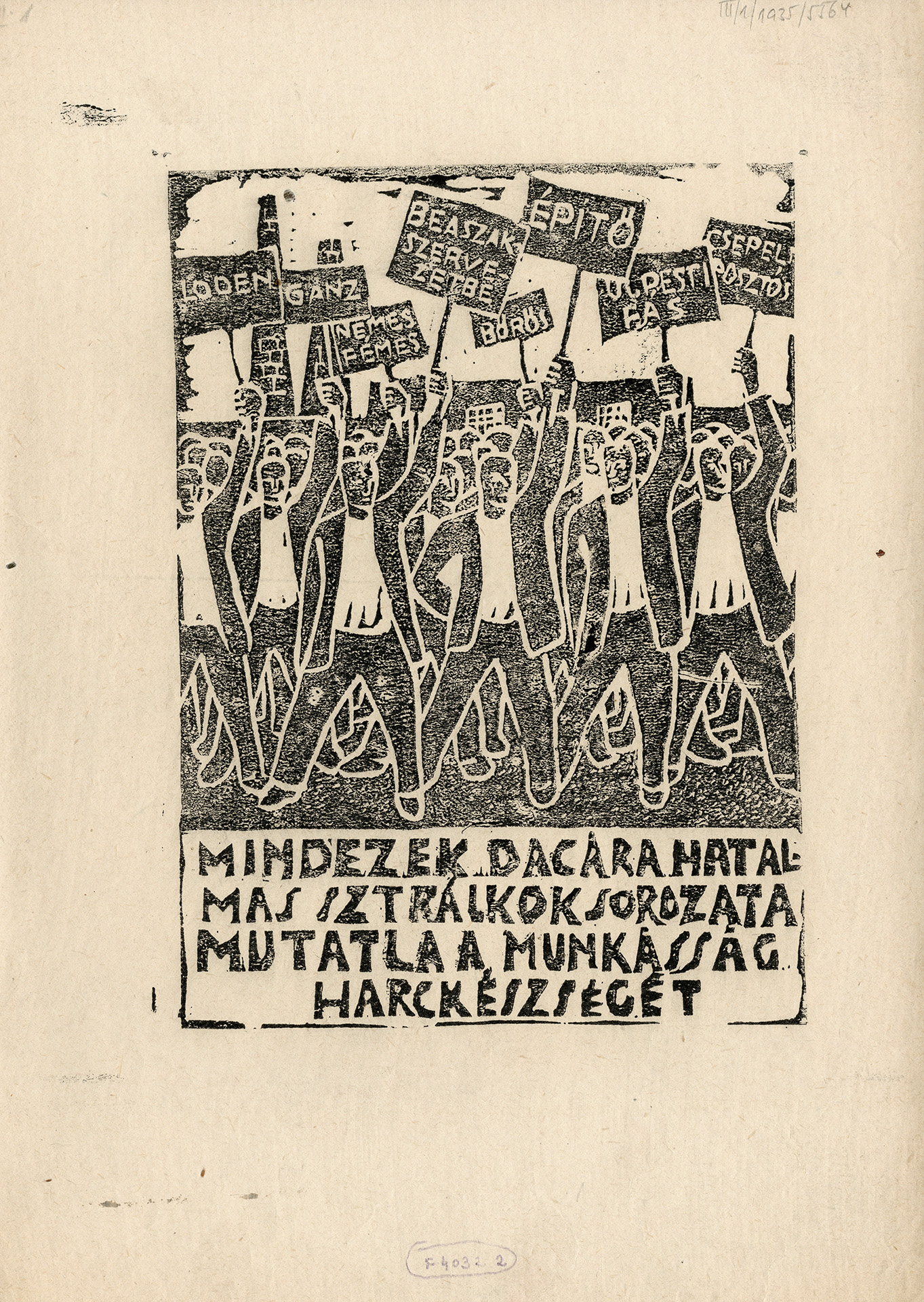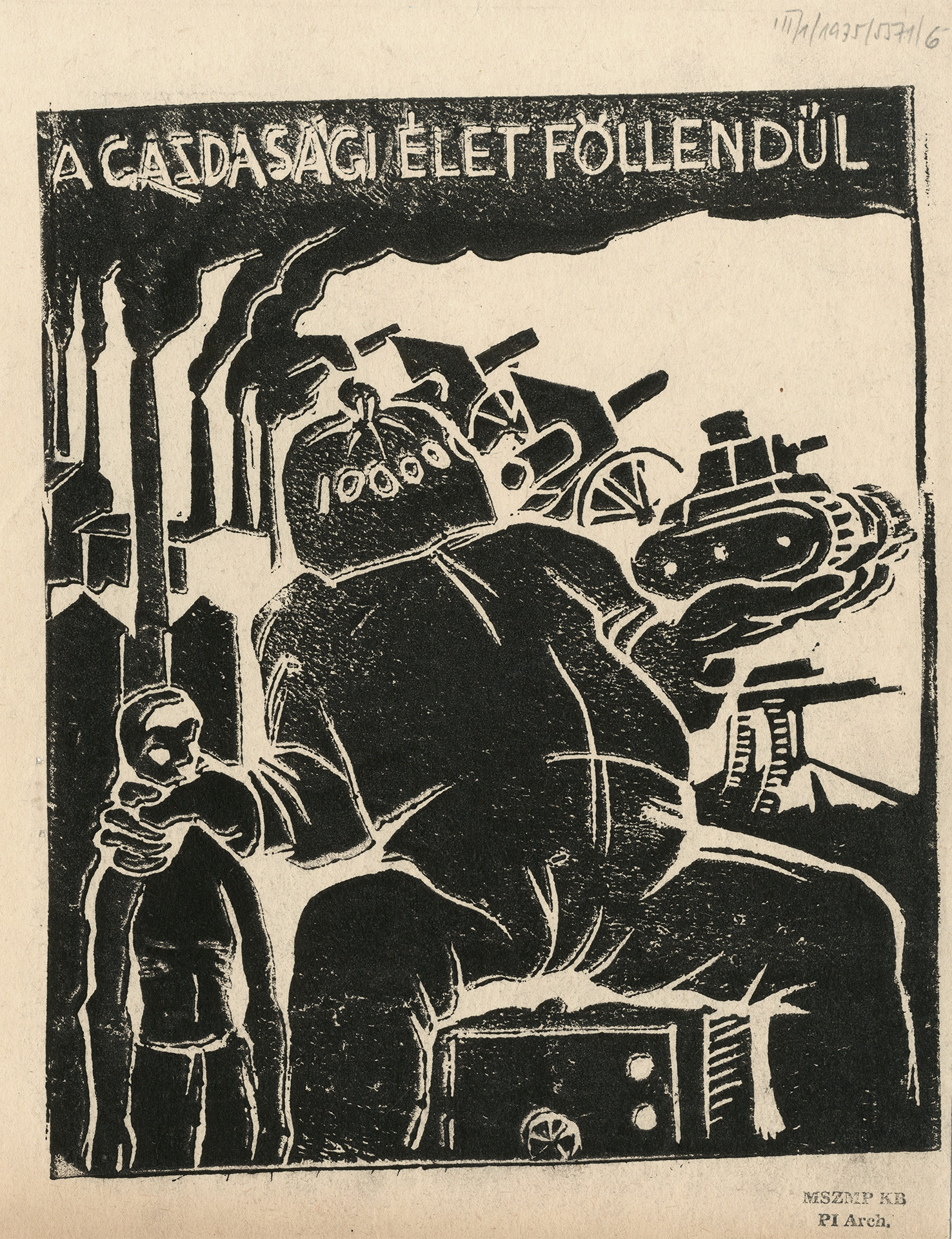 The Communist Party of Hungary (KMP), operating illegally in the 1930s, published countless leaflets, many of which were designed by renowned artists. The leaflets were designed by the Montázs Group [Montage Group] from around 1932, which partly overlapped with the Group of Socialist Artists; its members were Béla Bán, Endre A. Fenyő, György Goldman, Károly Háy, Andor Sugár, Dezső Révai and Tibor Bass. Károly Háy had worked for the Party even before that, using sometimes the most rudimentary techniques to create images for the flyers and leaflets. According to his recollections: “After the party reorganized its press apparatus, leaflets and flyers were regularly published by the party and organizations like the KIMSZ [Kommunista Ifjúmunkások Magyarországi Szövetsége, Hungarian Association of Communist Youth Workers], and the Red Aid. Most of these flyers and pamphlets were reproduced using stencils… It is true that the stencil method confines the possibilities of artistic expressions to rather narrow limits, but we also know from art history that many of these limitations imposed by technology become an inspiring and even style-defining force. In addition, on occasion we could organize the regular publication of linoleum engravings, which is one of the easiest graphic genres suitable for traditional reproduction, and sometimes we could also use the photograph as a reproduction method.”