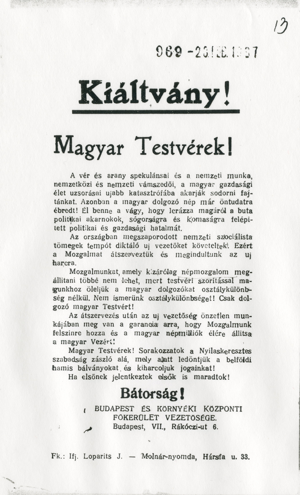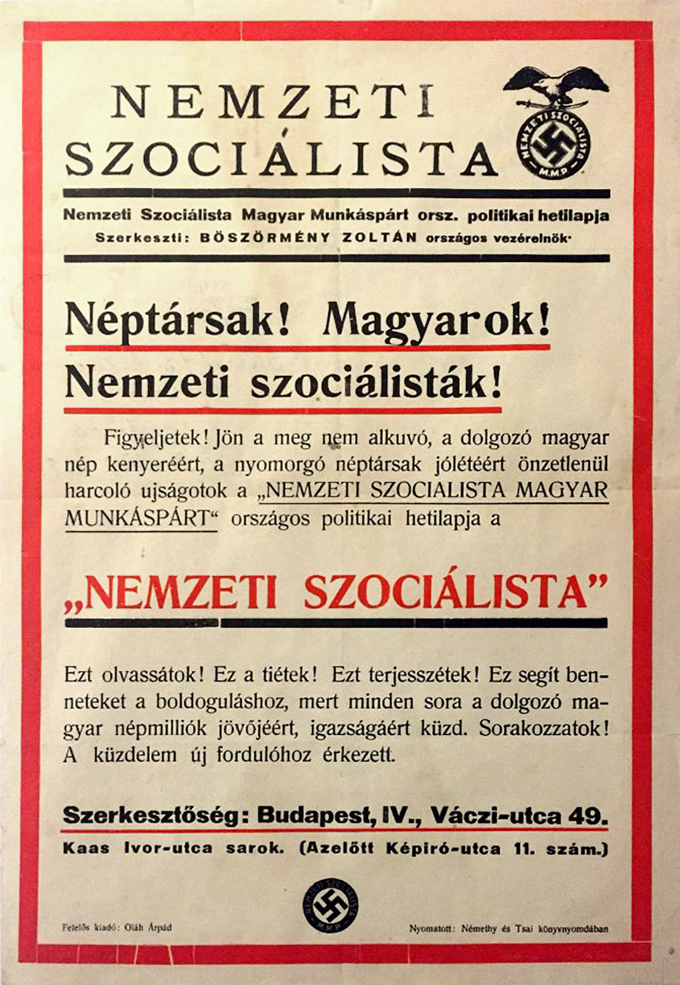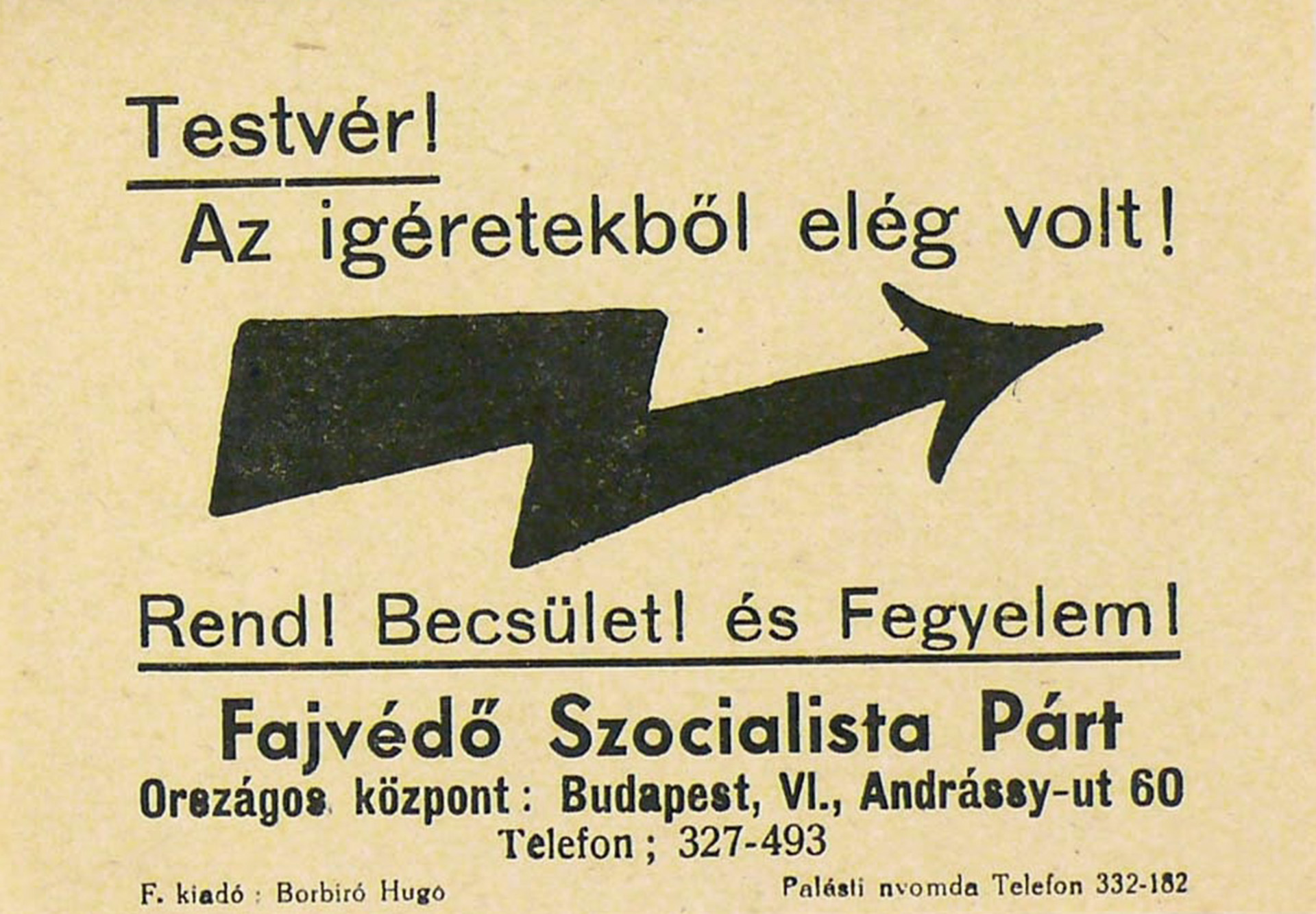 Flyer of the National Socialist Hungarian Workers’ Party [Nemzeti Szociálista Magyar Munkás Párt] (Scythe-Cross Movement), c. 1936