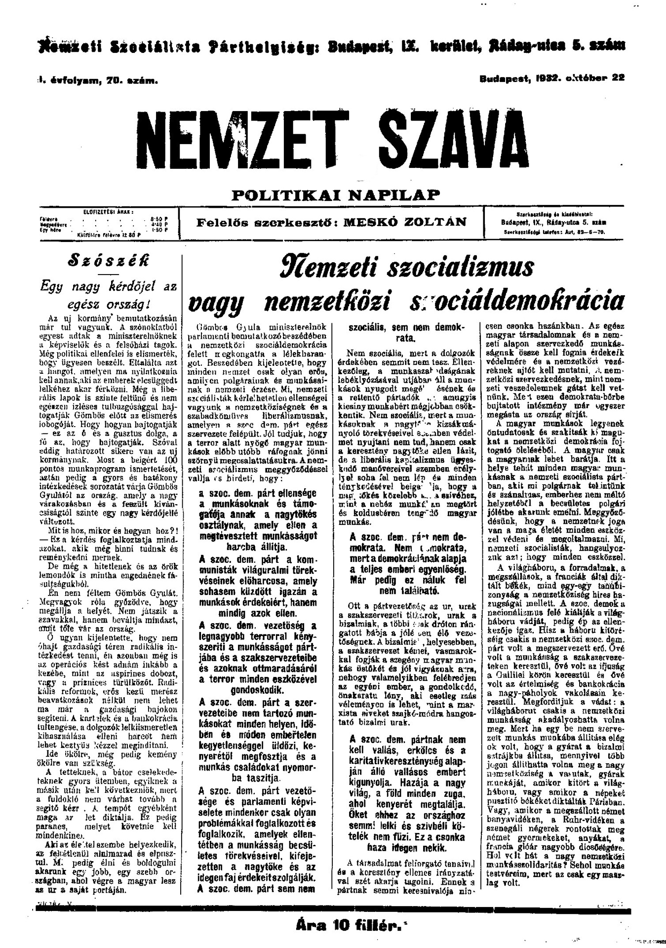 Nemzet szava [The Voice of the Nation], the weekly (later bi-weekly) newspaper of the Hungarian National Socialist Workers and Peasant Party [Magyar Nemzeti Szocialista Földműves és Munkás Párt], October 22, 1932